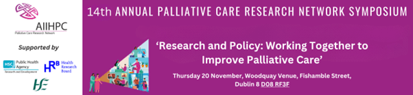 The All Ireland Institute of Hospice and Palliative Care (AIIHPC) 14th Annual Palliative Care Research Network Symposium was held in the Wood Quay Venue, Dublin 8 on the 20 November 2025. The theme of the symposium was on palliative care research and policy, ‘Research and Policy: Working together to Improve Palliative Care’. It was an all day, in person event that comprised of speakers, panel sessions and poster presentations. The event was supported by the Health Research Board, Health and Social Care R&D Division, Public Health Agency and Health Service Executive (HSE). It was approved for CPD by Royal College of Physicians Ireland and met the CPD criteria of the Nursing and Midwifery Board of Ireland (NMBI).