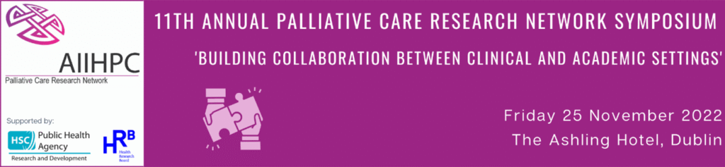 The All Ireland Institute of Hospice and Palliative Care (AIIHPC) 11th Annual Palliative Care Research Network Symposium took place on Friday 25 November 2022 in Dublin. This was the first in person symposium since 2019. The event was supported by the Health Research Board and Health and Social Care R&D Division, Public Health Agency and was approved for CPD (RCPI) and CEU (NMBI). There were 55 participants from the island of Ireland and internationally including researchers, people with life-limiting conditions, family carers, health and social care professionals, service providers, policy makers, charity organisations, funders and interested citizens.