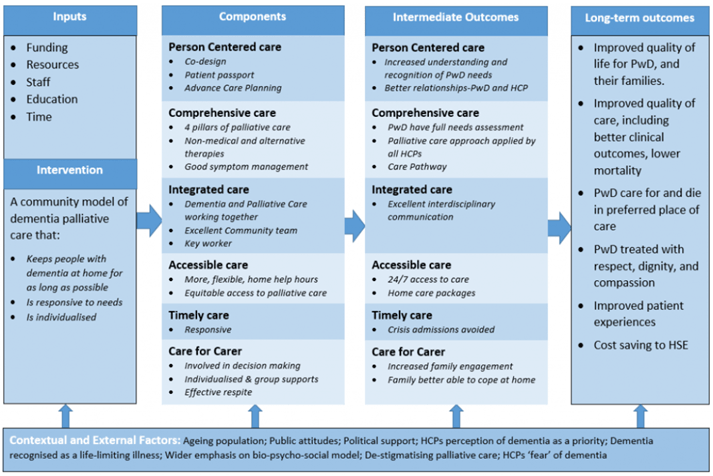 Phase 1: The research team designed a survey to: i) identify existing models for dementia palliative care in Ireland and the UK, and ii) to identify key components of effective models. The results of this survey (n=112) are mapped out in a logic model below (see Fig 2). A research paper based on the results of the survey study has been published (Link to paper).
